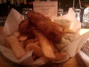 It was pretty good, the fish was moist and flaky and the chips were nice and chunky and it came in a basket which is so retro (although I expect accidently so). I am not sure what they were coated in but it was tasty. The tartar sauce was good to dip in, but the coleslaw was just wasted on me. Why does Fish and Chips need coleslaw anyway? I have never been given it in any Fish and Chip shop I have ever visited in England.