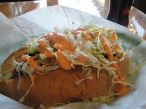 It was quite a surprise, the bun was toasted, cheese in the bottom, then a bacon wrapped sausage, covered in black beans, mushroom, lettuce and a spicy chipotle type sauce. Really quite tasty, and not just the bacon part. Crisp and crunchy lettuce together with the crunchy toast set the top and bottom texture and the filling of beans, mushrooms, cheese and dog were a good combination. Not too spicy more like a mix of ketchup and mayonaisse than chipotle. All in all for $5.75 with a coke worth the sortie here.