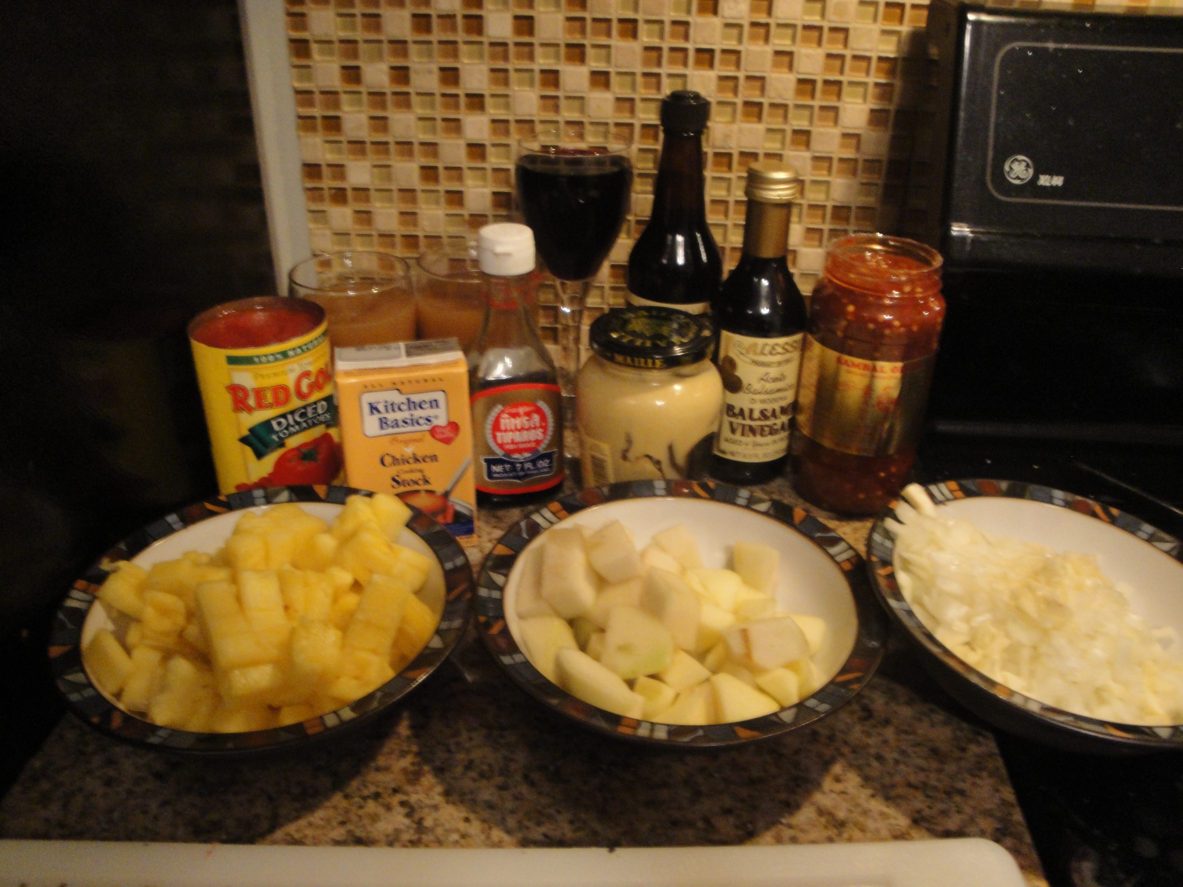 First steps was cutting up 1 pineapple, and apple and a pear, 3 garlic cloves and a small onion, then a couple of pounds of beef cubed and a whole load of freshly ground pepper.