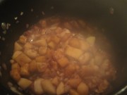 The next part of the soup was the bit that I was most doubtful about, adding pineapple, pear, and apple, plus some red wine. I was fine with the wine, and maybe one fruit but three? Ok I guess if a Top Chef thinks it works then I will run with it and give it a go. It certainly smelt nice as it was cooking and a nice sweet aroma filled the kitchen, a bit like a German Christamas market hanging around the Glühwein stall, kind of a savoury mulled wine mix. Although by now I had consumed a glass of the red wine I bought for cooking the soup so it was all going swimmingly well