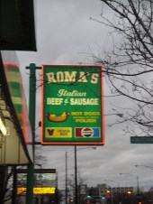 Across the road almost camouflaged by the storage facility I spied something that looked like a food outlet, but it could have been an office, after playing a almost deadly game of human Frogger through the freeway bound rush hour traffic I found myself standing outside Roma’s Italian Beef and Sausage.