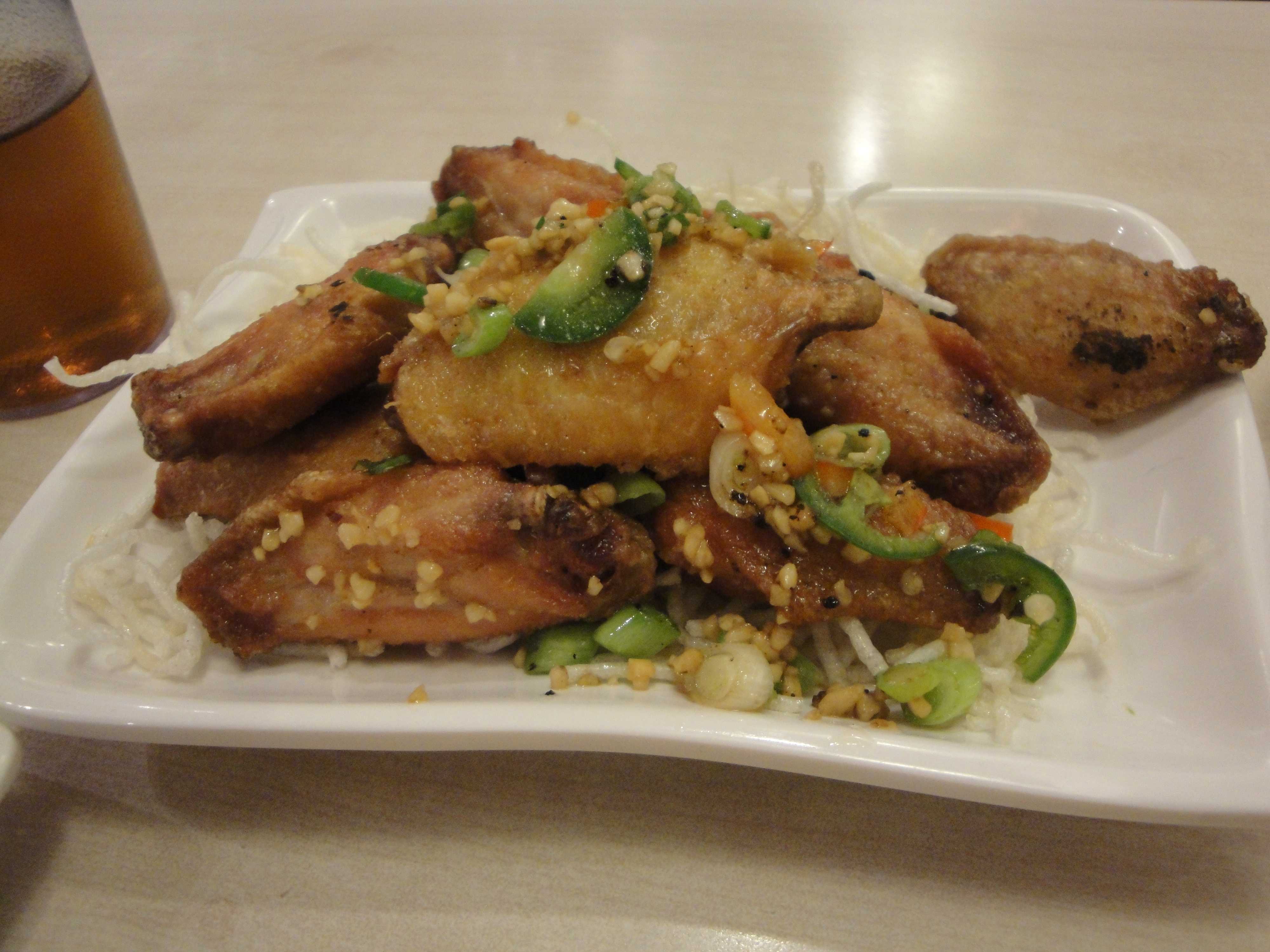 True to type I opted for some hot and sour soup and a plate of chicken potstickers, but this time just because they looked so good I threw in a plate of salt and pepper chicken wings, oh and a sneaky little tsingtao beer as well.