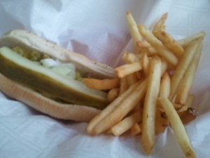 I selected a char dog, and I got the tiny version. The propieter must have heard that I had been browsing the weightwatchers site to see how many points a hot dog was (it was 15 but this one was probably about 7!). It was OK but the most I can say about Mangis is that it is clean, it sells lottery tickets and it also sells beer.