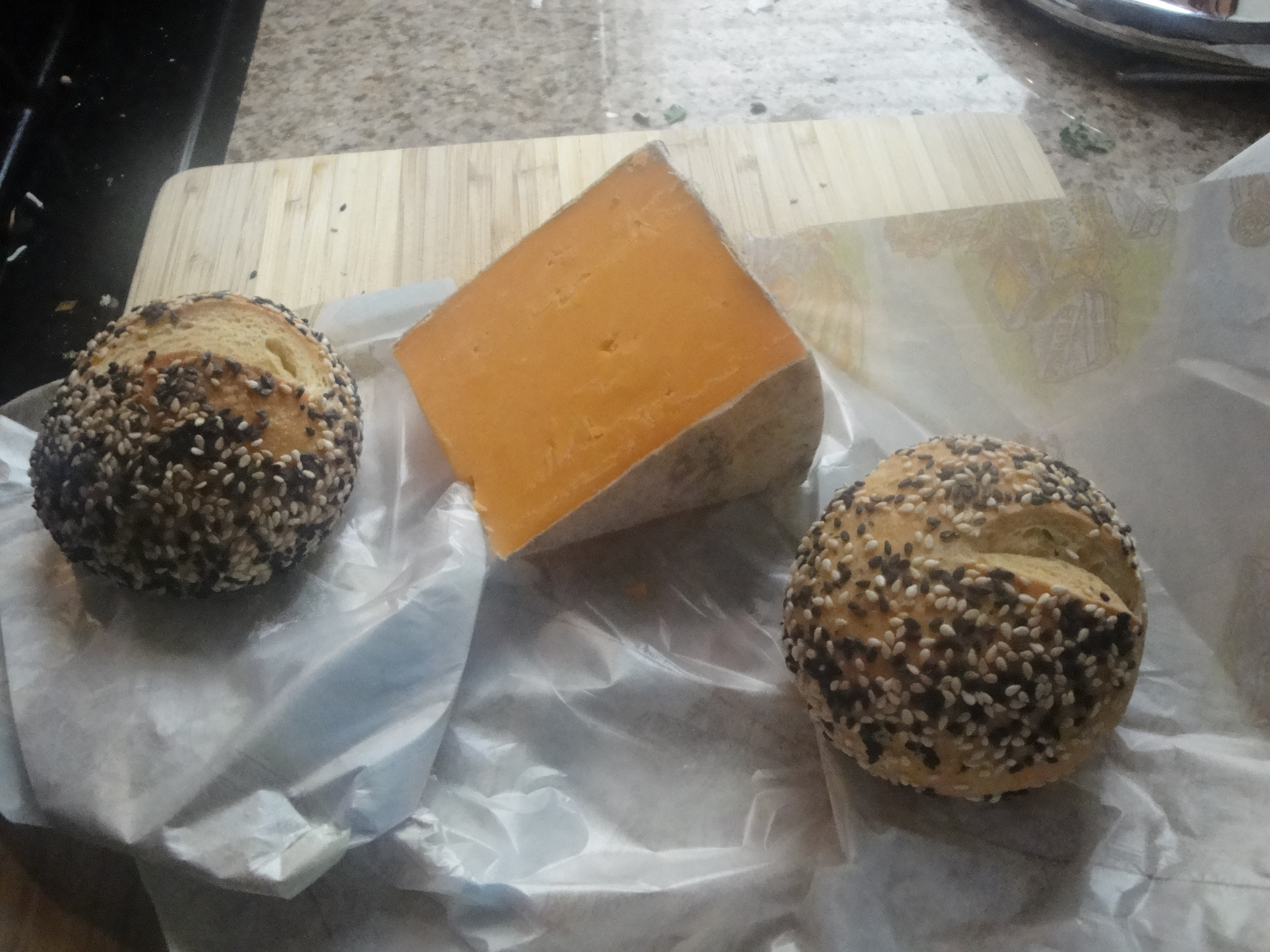 As a diversion from having to think about the soup I decided to look at the cheeses . The young lady behind the counter gave me a sample of the red leicester which was so good that I took a quarter slice of that home for my supper and a couple of small bread rolls to complement it.
