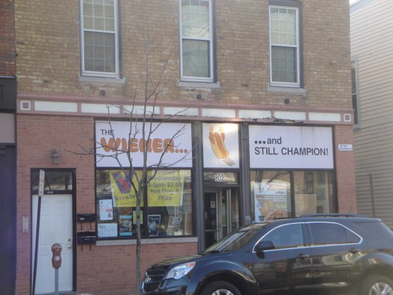 Fifteen minutes later the Purple El rolled into Dempster and I strolled along Dempster St passed the aging grafitti beneath the rail line until I spyed ‘Wiener and Still Champion’ across the road.