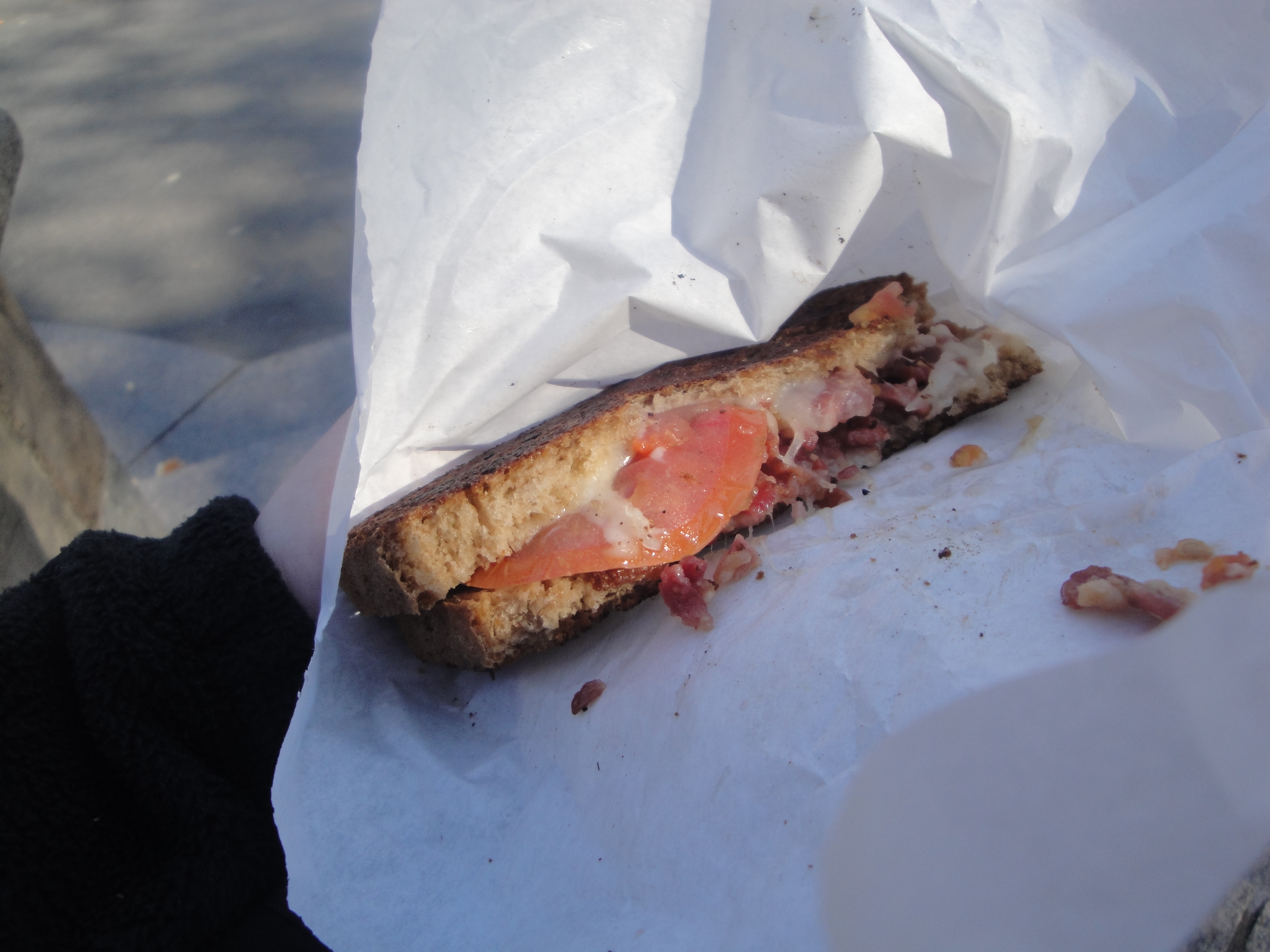 On this occasion I decided to go for one of the daily specials. Todays option as it happened was cheddar cheese with bacon and tomato, it came with tater tots and a drink for $9. It was not bad, the toast almost a little close to being burnt but lets call it lightly charred in the interest of food truck slight bias. The filling was nothing too exciting and the tater tots were just plain old tater tots. Despite all that it was very pleasant sitting in the sunshine in Union Square eating this food truck offering.