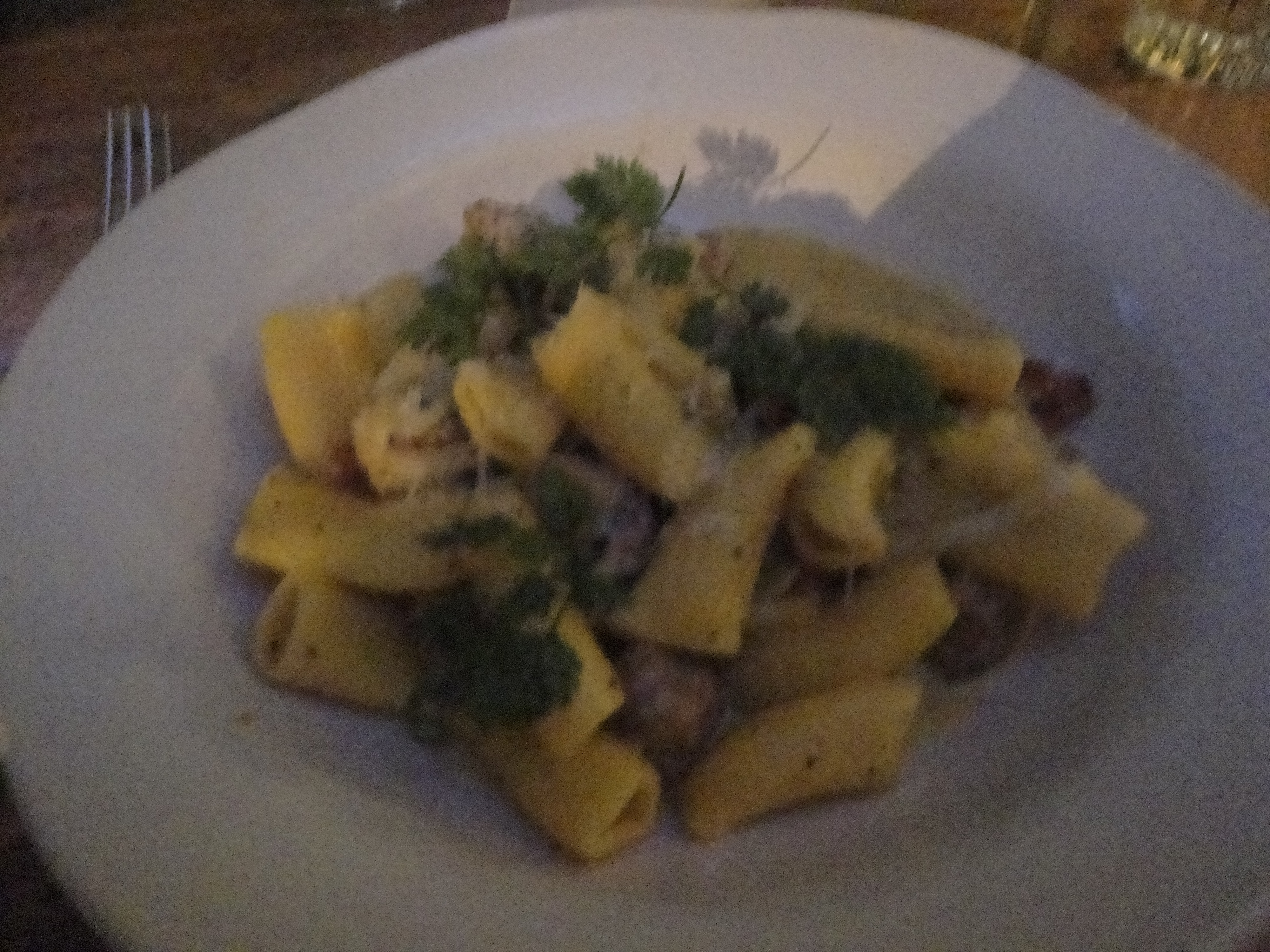 My main course was predetermined by my oh so sad blogging instincts and I was always going to have to try the “Mini Meatball carbonara” – ‘served Roman style with lemon cream sauce, Parmesan, and rigatoni pasta’. I had recieved reports that his meatballs were smaller than mine and that his sauce was more creamy and less lemony. I was beginning to suspect that this was because it was a different recipe.