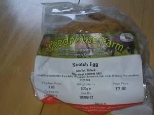Today at the Farmer’s market in Loughborough I chanced upon the Woodhouse Farm stall where a young chap was selling a whole load of meats from the farm, sausages, bacon, hams, steaks, black pudding and much more. In amongst that were a few ‘misshapen’ scotch eggs. As I picked one up, in between offering us four packs of sausages for 10 quid, he casually informed me that the Scotch Egg was a pig yesterday, well just the sausage part that is unless pigs come from eggs in Leicestershire. He had made all the sausages and the scotch eggs himself and it was hard not to buy into the whole farm to shop deal.