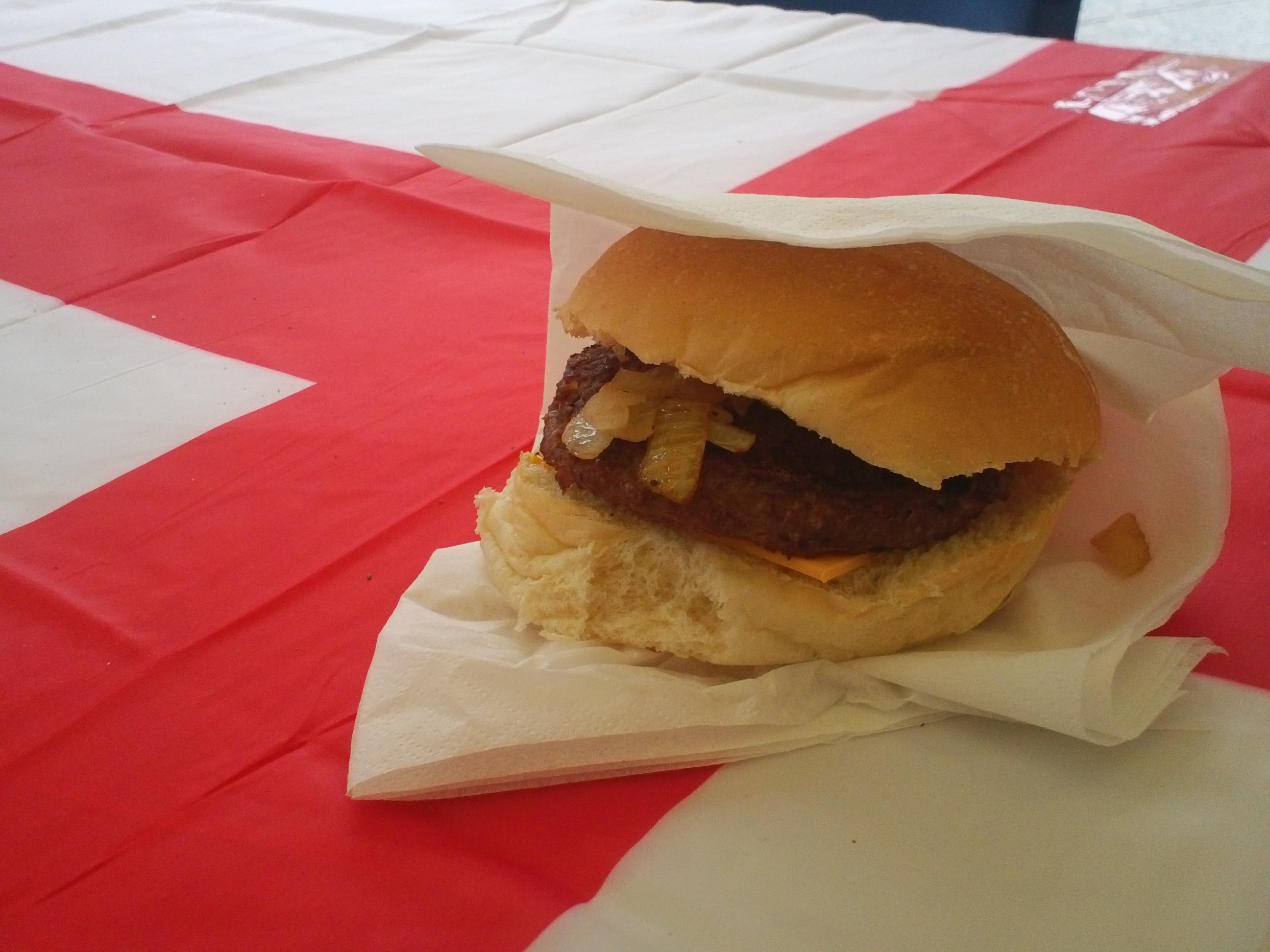 I went for the Kangeroo burger with some onions and cheese in a white bap. I even got to eat it in a Jubilee inspired tent on a St Georges cross table cloth.
