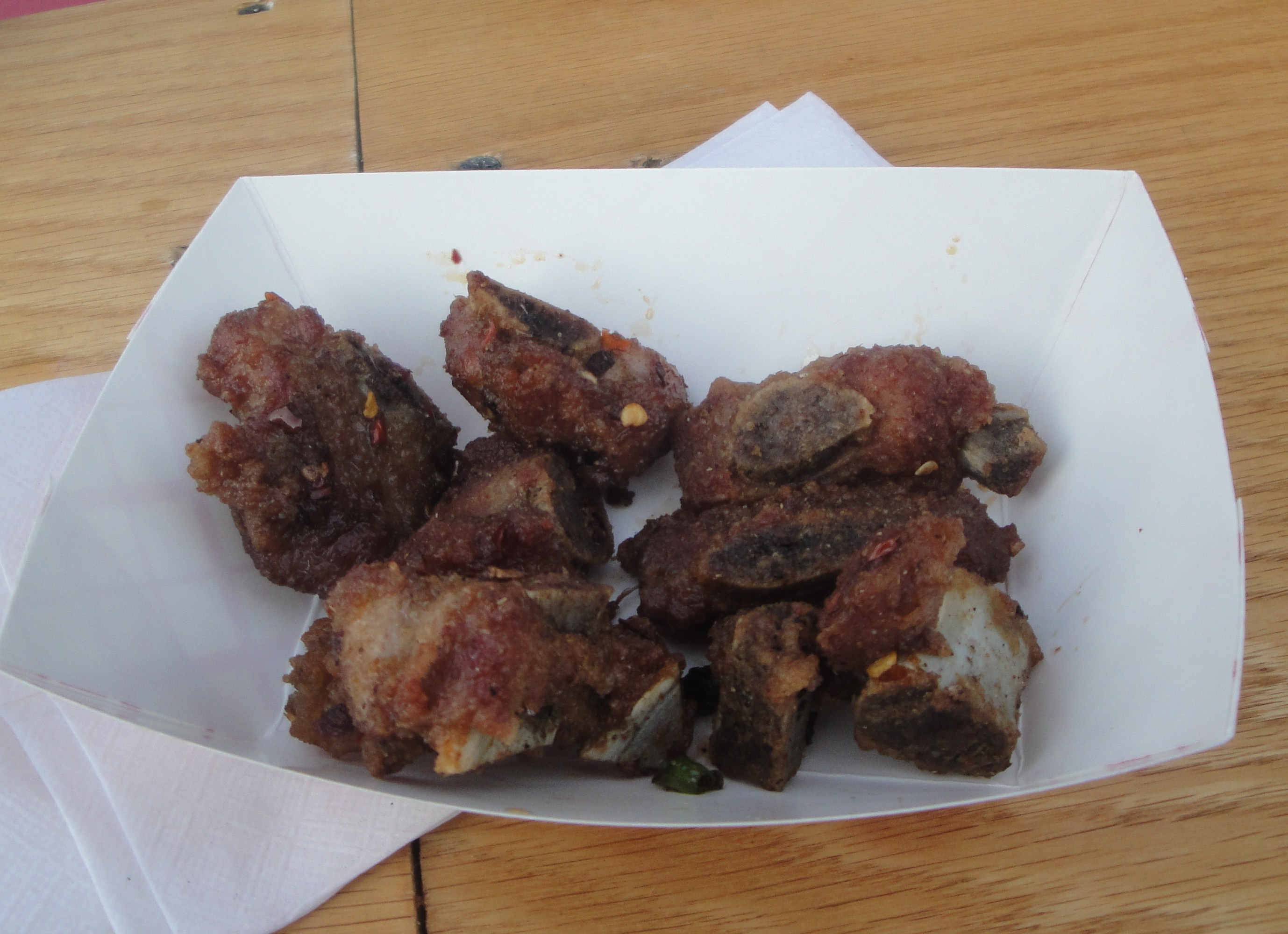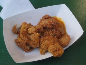 I have had the Mustard fried catfish from BJ’s market at previous years ‘Tastes’ and I have to say it is one of my favorites and one that I was seeking out when I came here. You get a reasonable portion for 5 tickets and it pairs nicely with their sweet honey mustard sauce. I also like that the mustard coating mixes well with the moist earthy tasting catfish, although this year the fish seemed less muddy in taste. Again these are very good.