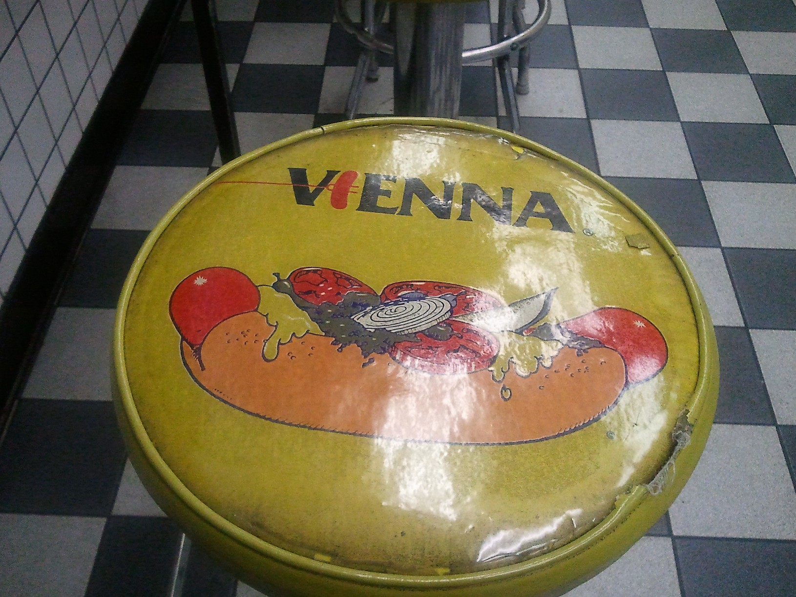 Carrying on my new theme of not just trying the basic hot dogs of the menu, I searched the board for something slightly different. Bingo, my eyes alight upon a small side board describing a Pastrami Burger. This was listed as a double cheesburger, with mozzarella cheese, lettuce, tomato and mustard topped with pastrami for $5.99. I ordered and sat down on one of their classic stools covered with a vienna beef hotdog picture. I really want this stool.