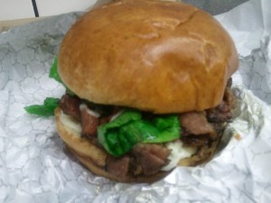 About five minutes later my order was ready, once unwrapped I was feeling quite happy, it certainly looked pretty enticing. Once I bit in to it, it was like “Oh my good lord”. It was ridiculously tasty, every mouthful worked. First there was the soft moist egg bun, then the cheese, mustard, and mayo was all melted in with the mozzarella to create a mild mustardy cheesy sauce that oozed into the bun and onto the burger. The romain lettuce was fresh and thinly sliced, lying just above a topping of thinly cut pastrami on top of a double cheese covered stack of burgers. The whole thing went down in about five bites and my waistline did not even groan in protest, in fact I think my stomach might have shrunk slightly in the hope that I would feed it with another one of these burgers.