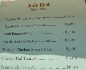 There was a simple selection geared up to the average American who likes the basic Chinese and that has no desire to know about any special dishes, “Chicken on a stick” yes please, “Dumplings with meat in them ?” thank you, “other stuff we have heard of?” yes thanks for that too, nothing scary, nothing expensive and stuff that they can munch easily. Slightly snobby yes, but remember I am eating this stuff too, and have no qualms, OK I like authentic and I mean really authentic, but just like I can eat a McDonalds on occasion I can eat Westernised Chinese food too, and I do love it when it is done well. I would be curious to see what they have to offer inside their resturant and if they have a secret menu with the good stuff on it.