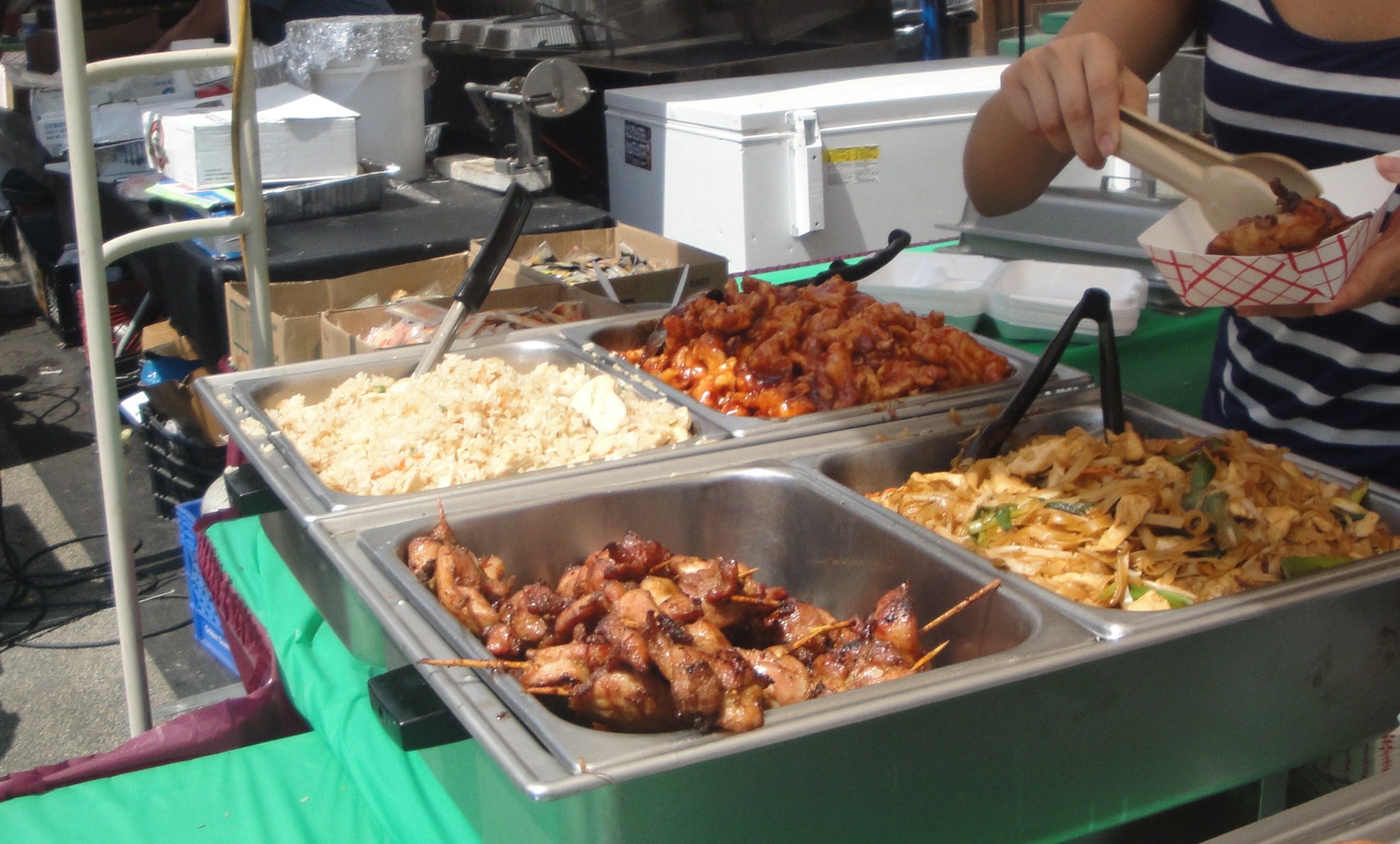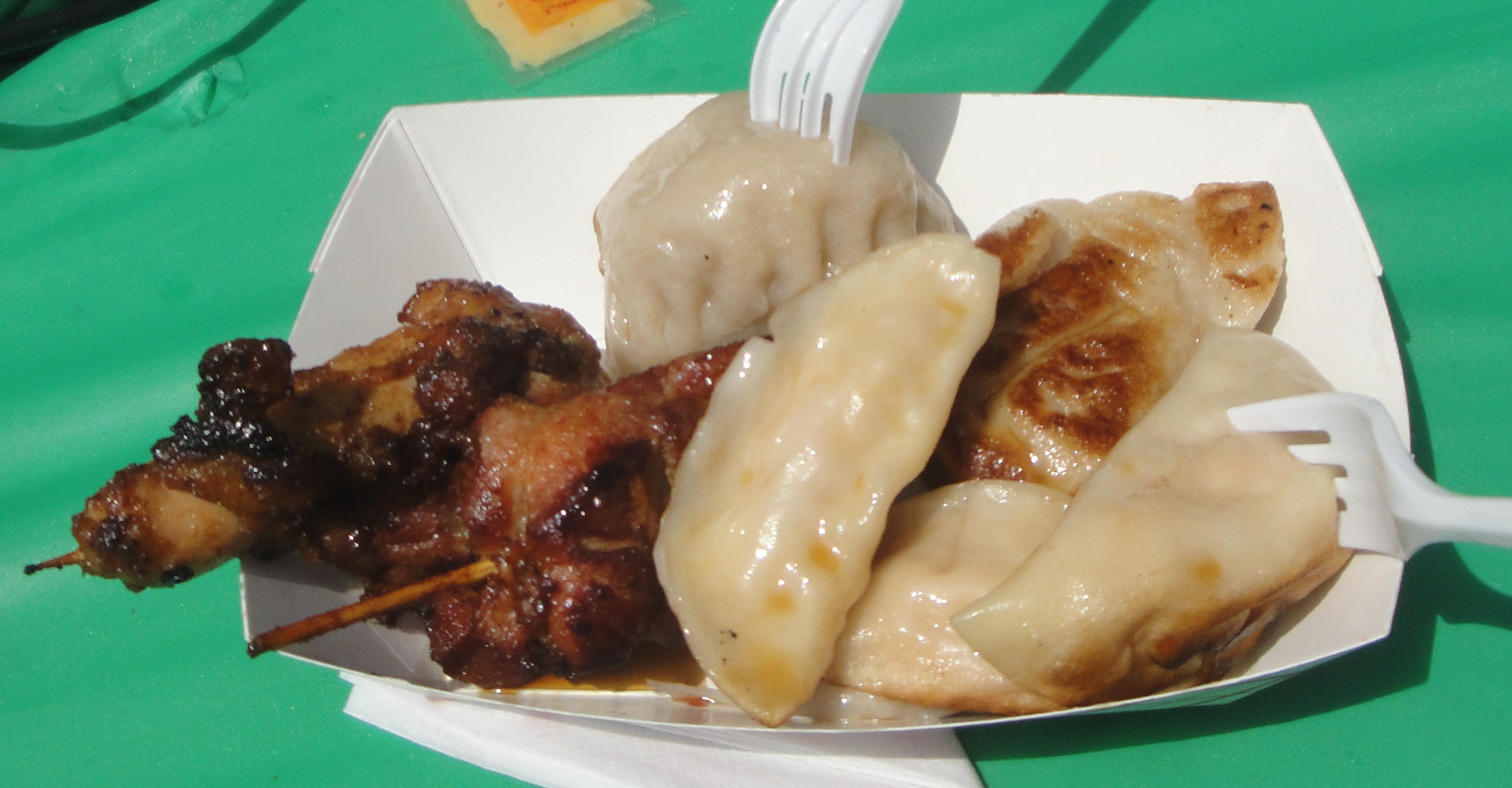 For $7 you could get a plate of three selections from the menu, this seemed to be the best option so I went for the two different types of Potstickers (3 chicken and 3 pork) and the Teriyaki Chicken Skewers. We settled down to share this plate on the table alongside and the two ladies who were working the stall were very friendly and offered us some free crab rangoons and another skewer.
