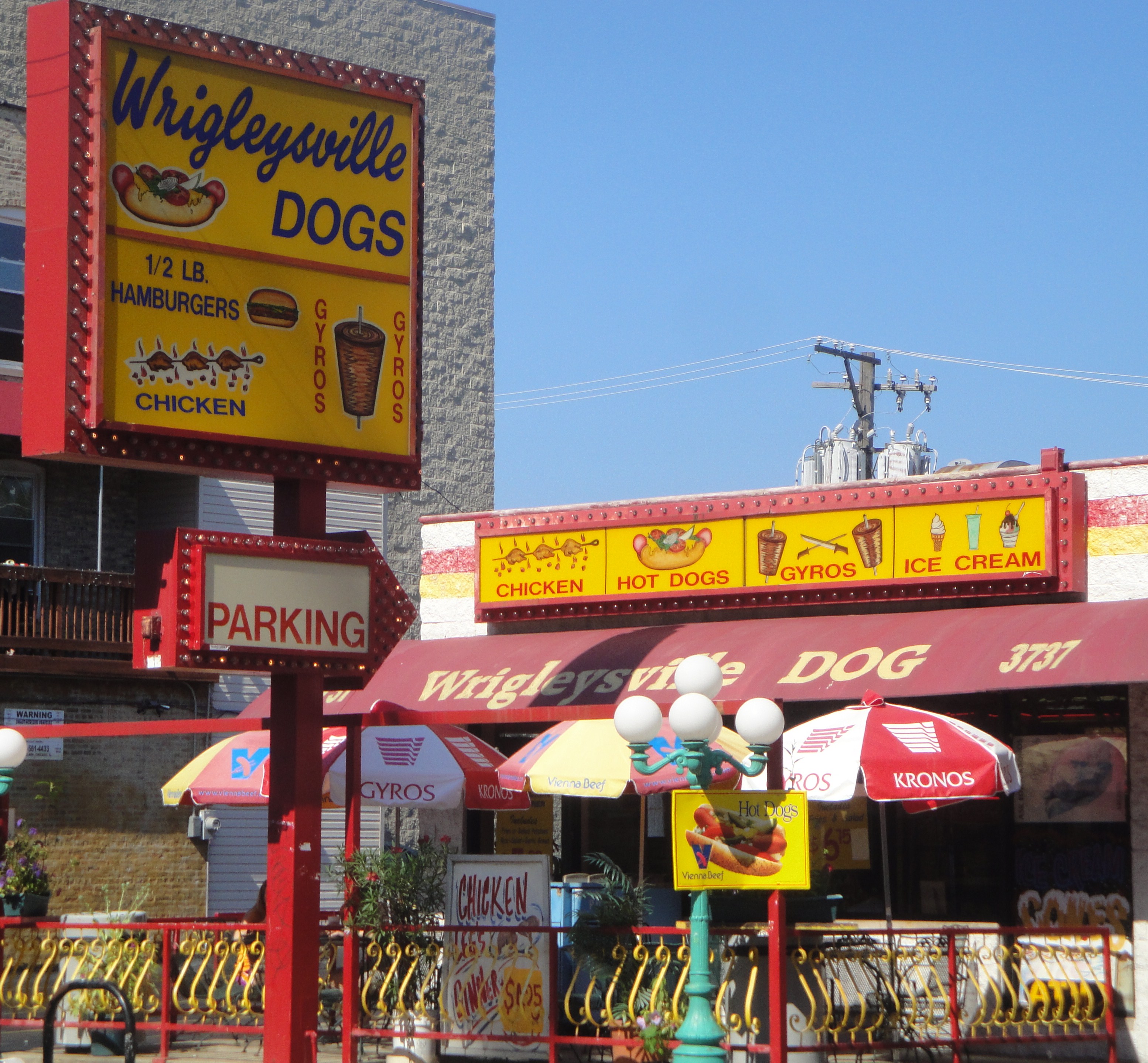 Wrigleysville Dogs is located at 3737 N. Clark St and it about 5 minutes walk away from Wrigley field and the Addison red line CTA El stop. You could also get the CTA 22 bus which passes by on its way along Clark Street. Website: http://www.wrigleyvilledogs.com/
