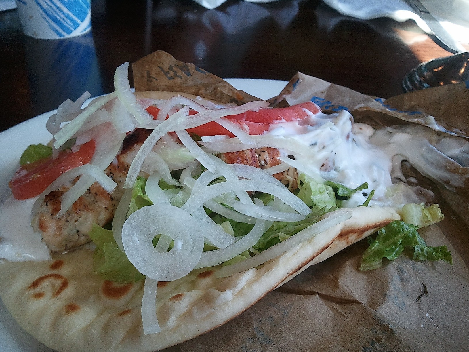 So this week I hurt my leg and had to rely on the kindness of my fellow men or in this case women to drive me to lunch. On this day it was in the suburbs and we were talking Greek Food at Greek Feast. From the outside in the sunshine I really felt that I was on one of those package tours I used to take in my late teens and early 2o’s over to the Greek islands. We would practically live off chicken kebabs in pita, and to be honest that was a great fresh flavour that I still can recall “Souvlaki ma creas” was what we asked for, which I believed was Chicken Kebab with chips. It probably wasn’t though.