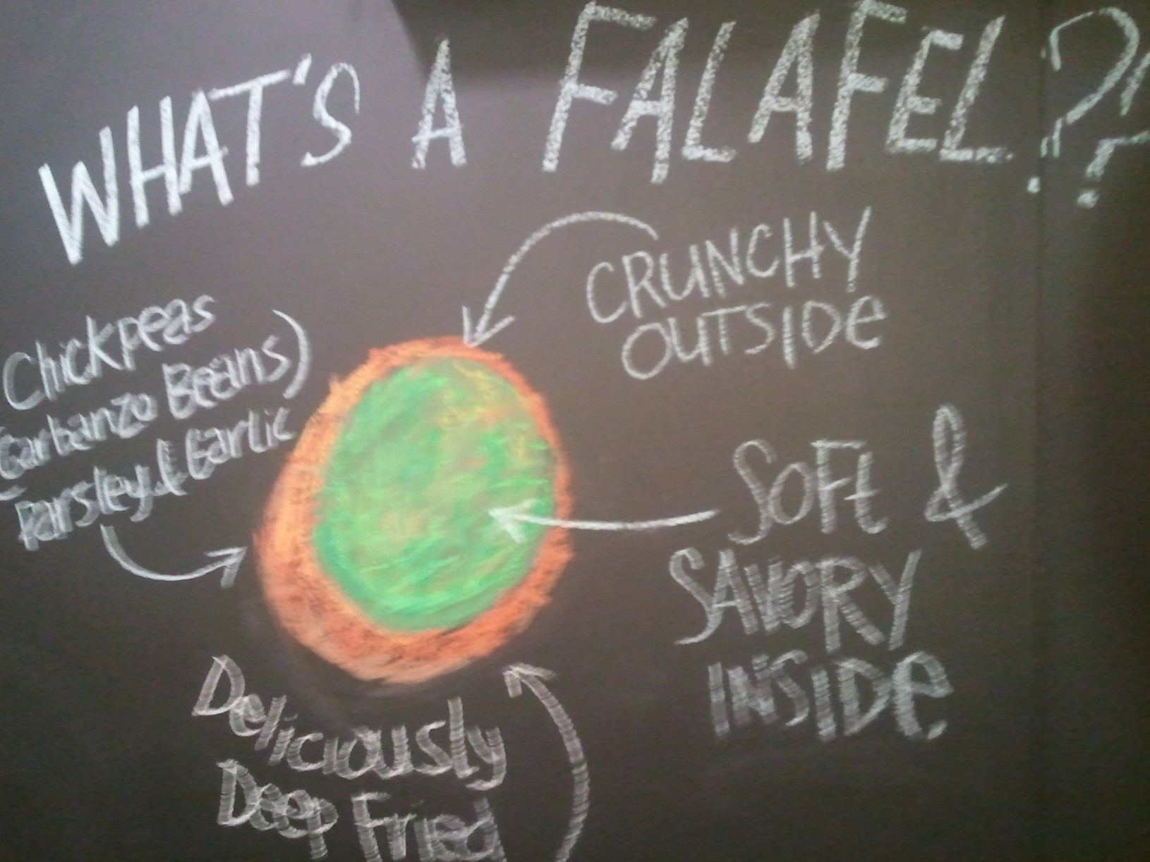 I am starting this blog entry with an explanation of what a Falafel is, purely for the benefit of my good friend Kristian, he asked me once before but I though that he would appreciate this in picture form. It was on the chalkboard wall at Fallafill so perfect. So anyhow I found myself wandering down from the Belmont El station along W. Belmont Avenue towards the corner of W. Belmont and Broadway heading towards the ‘unabridged book store’ as they have a really nice cookery section. Usually if I am down this way I end up getting some of the really good chicken from Chicken Hut. This time however I spotted a few more new places that I had not tried, one of these was Falafill. I am no great consumer of this snack but I did get some nice ones from a Food Truck (Crisp) in NYC last winter so I thought I would give them a try out.