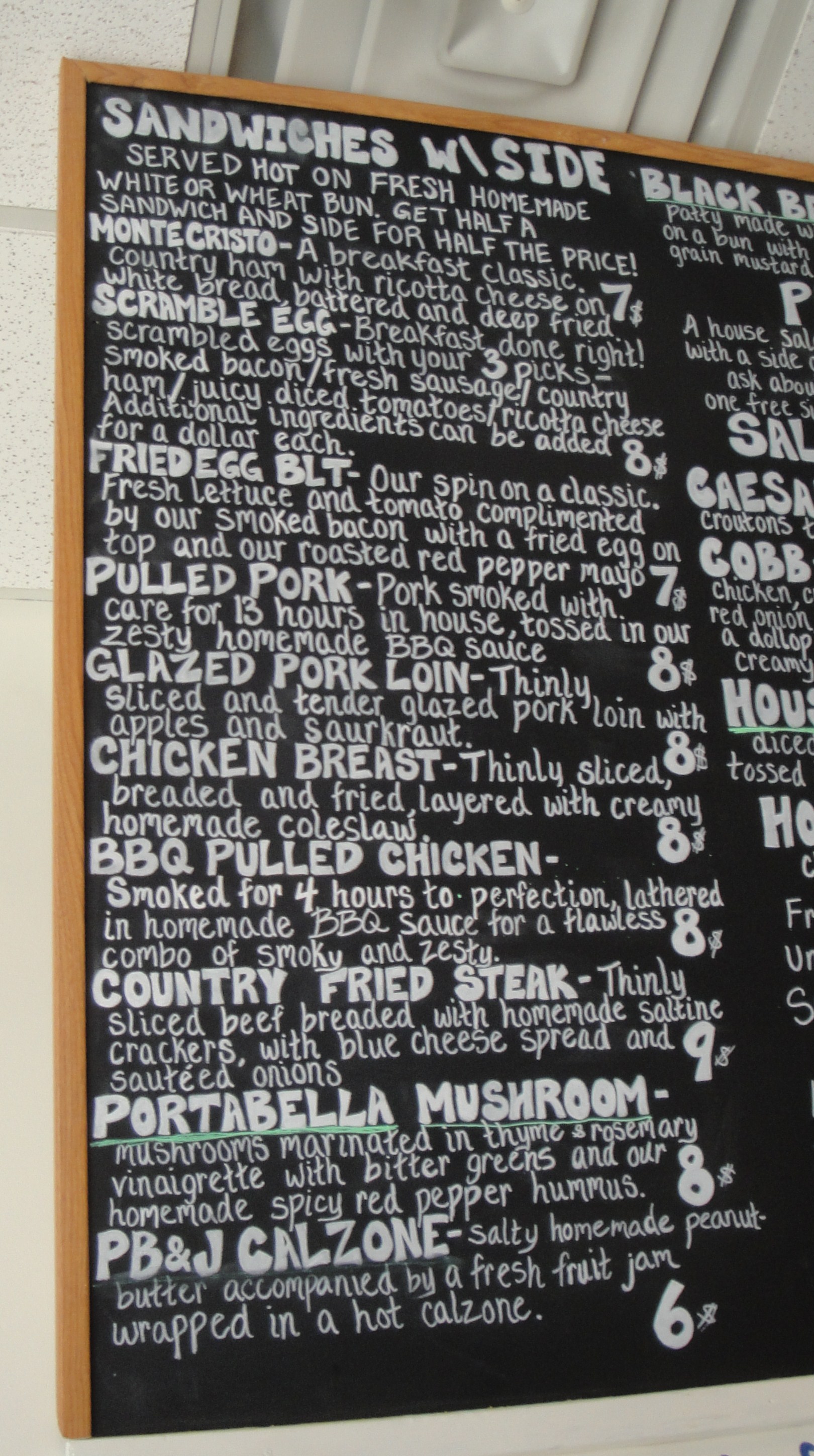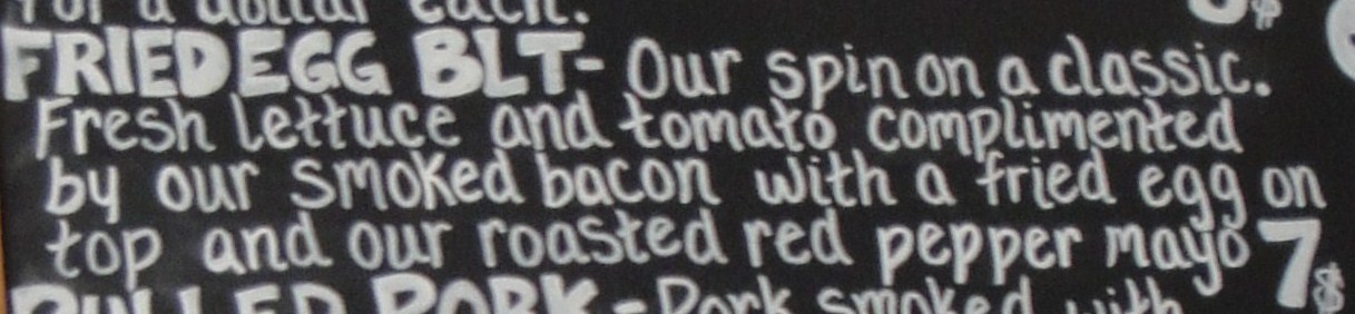 Both inside and outside your eyes are embattled with a selection of tasty sounding sandwiches, specials, and sides. The ‘sandwich’ board outside listed the specials, daily soups and homemade drinks. In the window is a picture montage of all the sandwiches that they have on offer, while inside there is a huge chalk board giving the breakdown of each sandwich. There are a lot of really great sounding combinations and initially I was considering one of their pork loin or pulled pork sandwiches. But no, I was sucked into having a Fried Egg BLT, well when I say that it sucked me in, to be honest it just shouted out to me from the menu board and became the only option I wanted to consider.