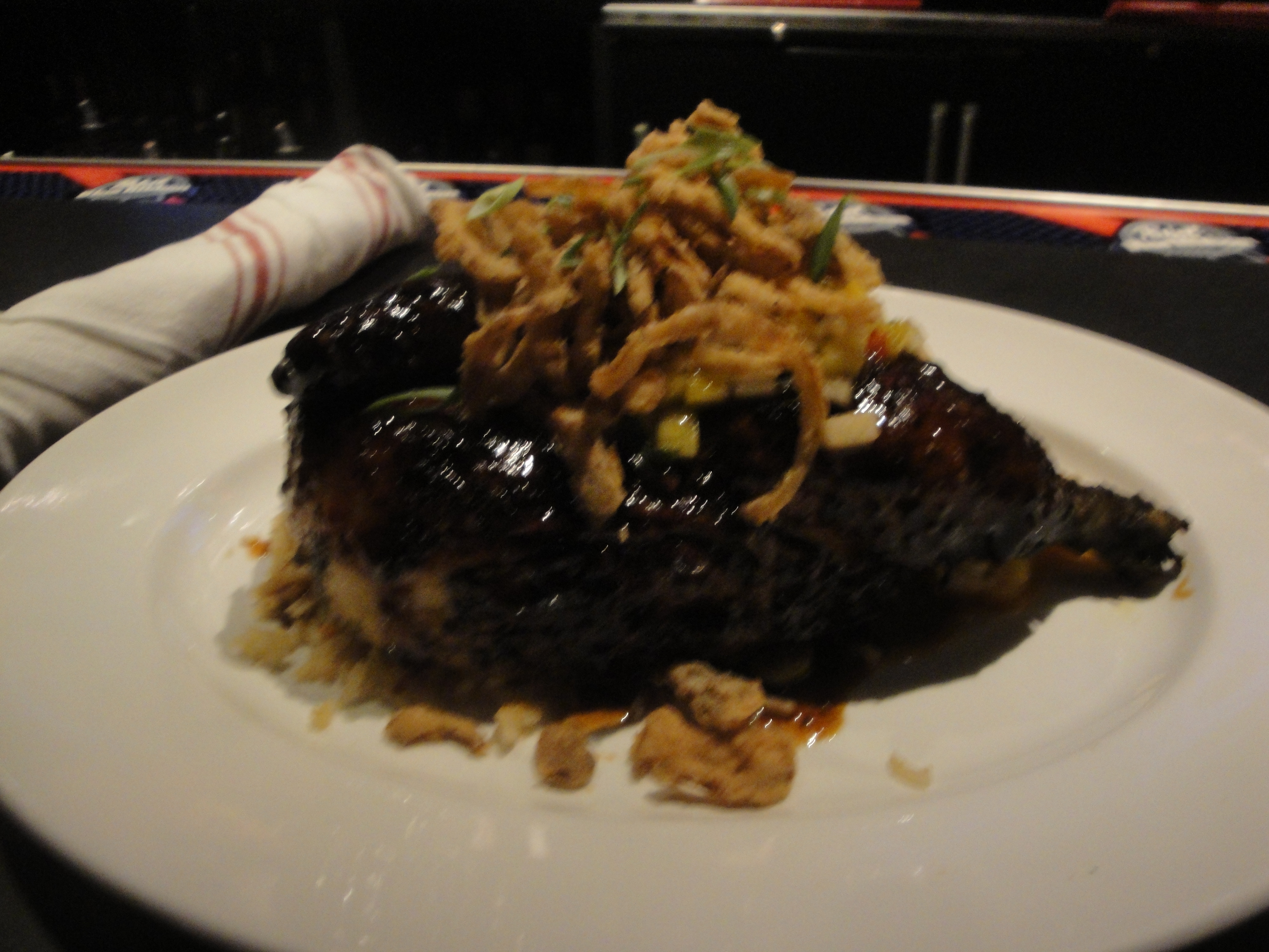 So in simple laymans terms what we have here is Beer and Chicken. To be more explict- Guys “Huli Huli Hawaiian Chicken, described as laquered in a sweet Hawaiian BBQ sauce, served with rice a munee, mango salsa, and crispy onion straws. The chicken is cooked downstairs on the rotisserie. I have to be honest, while the flavours were really good and sauce was tangy and smoky. The breast meat of the chicken was verging on being a bit dry, it was ok but not perfect by any means and when you are paying $19.50 you know you kind of hope that someone can cook a chicken.
