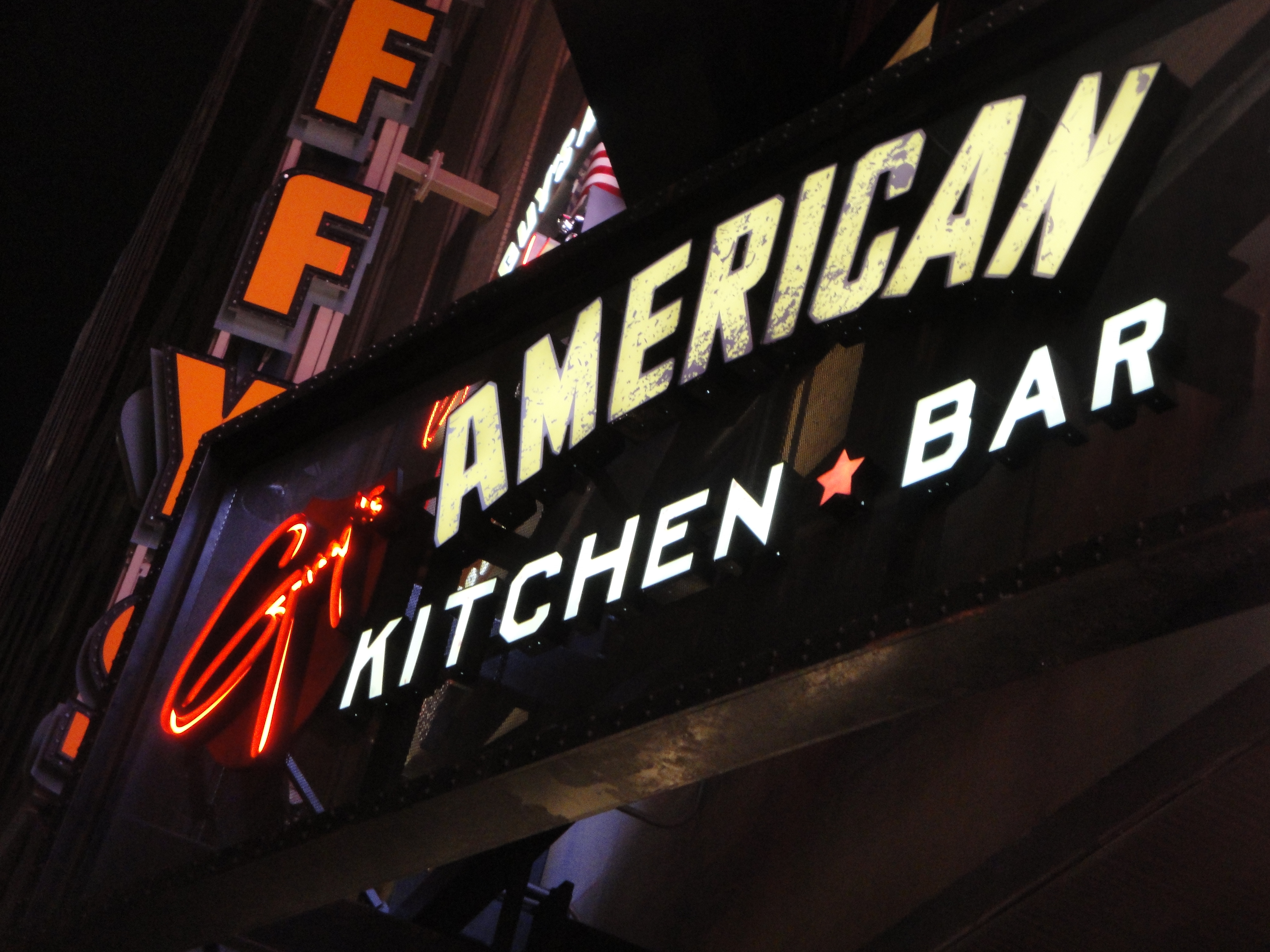 Located at 220 West 44th Street Between 7th and 8th Ave, around the corner from Bubba Gumps and the opposite side of the square from Toys R Us. Website: http://www.guysamerican.com/