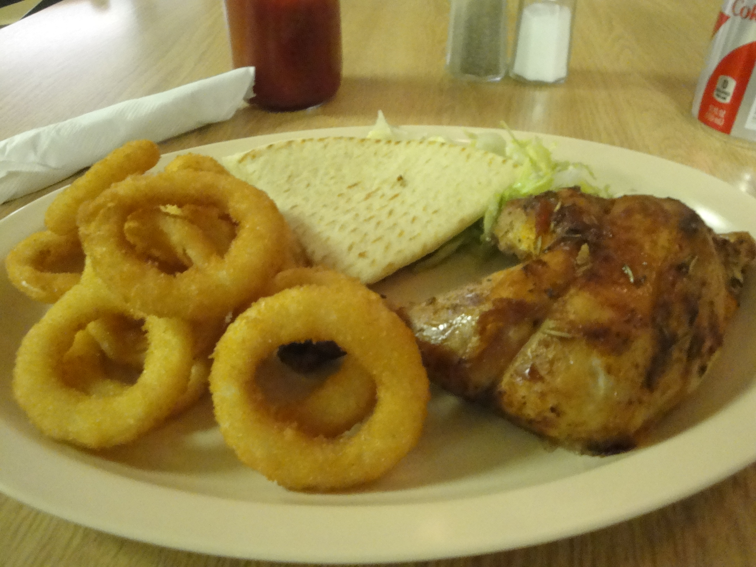 I went very simple and just had a small 1/4 dark chicken with pita and one side, in this case some onion rings. Not the best choice but probably not the worst. Another good thing was that the onion rings were freshly cooked (even if they were frozen) I wasn’t getting any left overs. The Chicken was tasty and acceptable without getting anywhere close to amazing, there was not too much flavour to excite, but it was moist, juicy and had a nice crispy skin. The pita and somewhat pitiful salad just filled up the plate. But I was just really sampling the chicken so didn’t pay to much attention.