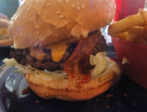 My choice was the “All American” Burger. This was a 1/2 lb burger ‘stuffed’ with bacon and Worcestershire sauce, then topped with some more slices of bacon, some American cheese which had melted or rather oozed across the burger, a crispy bit of lettuce, some juicy tomato and plain mayonaisse. It was a great big juicy burger, lots of bread and when I cut it in half to show you the filling you can almost see the chunks of bacon bits with which it was stuffed. If you cannot see them, don’t worry I can vouch for their presence and not only that but you could really taste the saltiness of the bacon within the burger.
