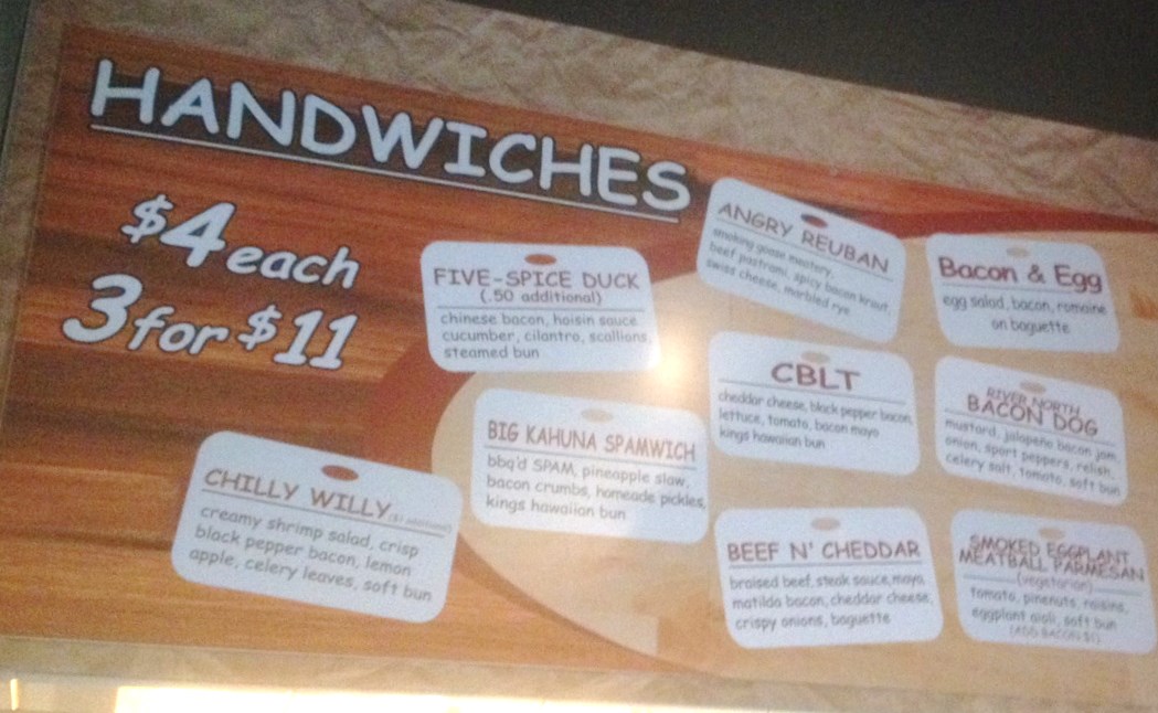 After chatting to the lad behind the counter, it turned out that a box of three was about the equivalent to one big sandwich so the best deal seemed to be to get a selection box of handwiches for $11. Once we established that we were going to pick three handwiches, it was pretty easy to filter out the options that best matched my personal taste bias.