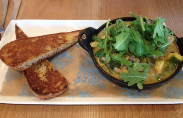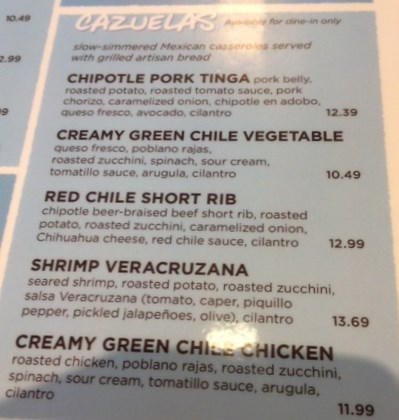 Just for once we found ourselves with a bit of time to kill so I was able to have a proper meal and not just a sandwich. I started to peruse the larger plate sections of the menu and my eyes alighted upon the Cazuelas described on the tagline as ‘slow-simmered Mexican casseroles served with grilled artisan bread’. Fair enough I am happy to give that a whirl.