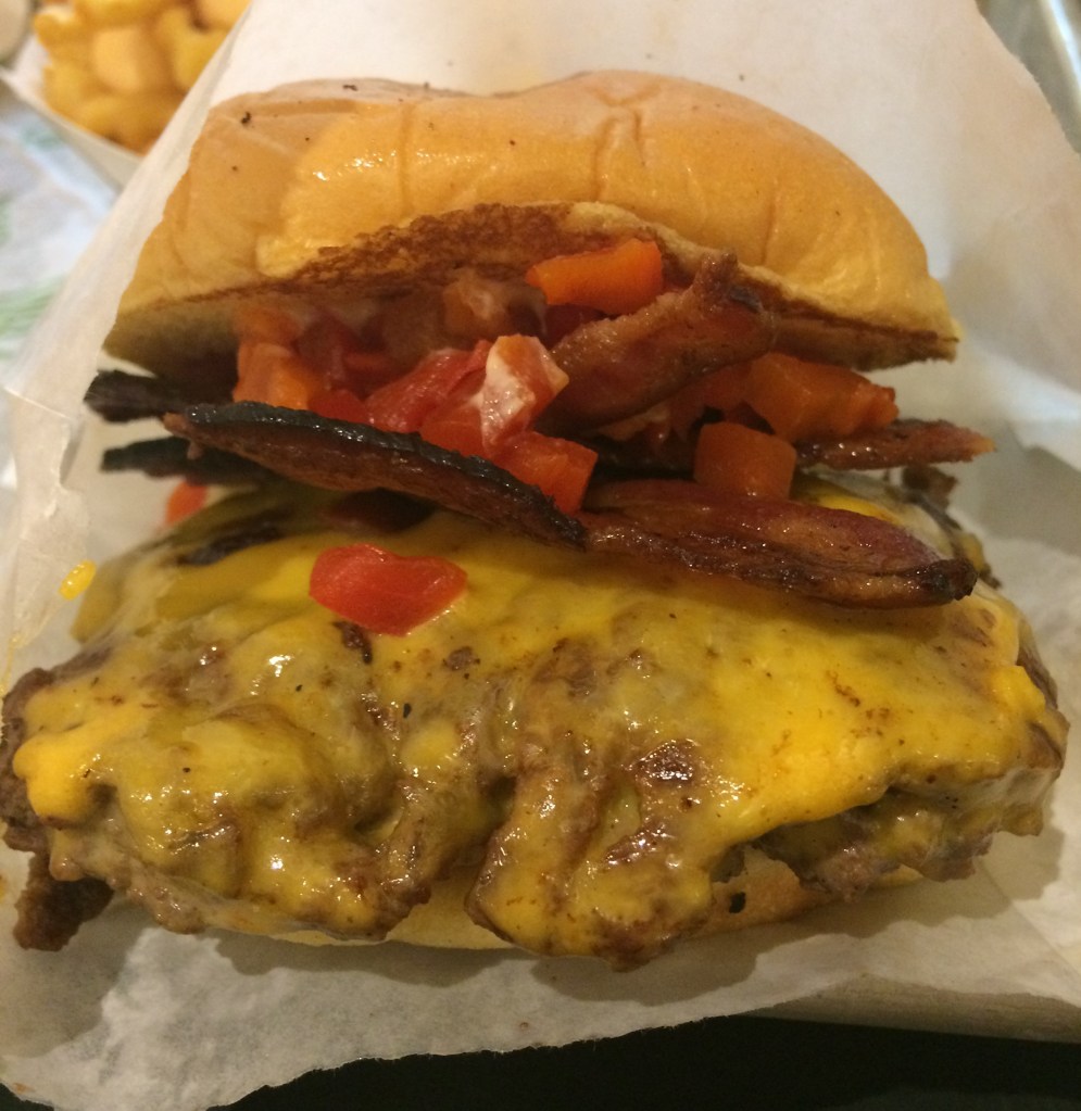 This time I went for the Double, so I had the “Cheeseburger with all-natural smoked Niman Ranch bacon, chopped cherry pepper and Shack Sauce” for $9.69.
